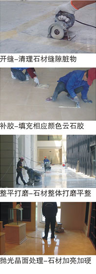 3、石材翻新將發(fā)生污染或病變的石材如凹凸不平的石材表面、深度劃痕、深層污點等使用進(jìn)口石材翻新機(jī)配合多套不同的磨盤、磨片,由粗到細(xì),進(jìn)行多次打磨、拋光,使石材在原有的基礎(chǔ)上恢復(fù)其本來面貌。